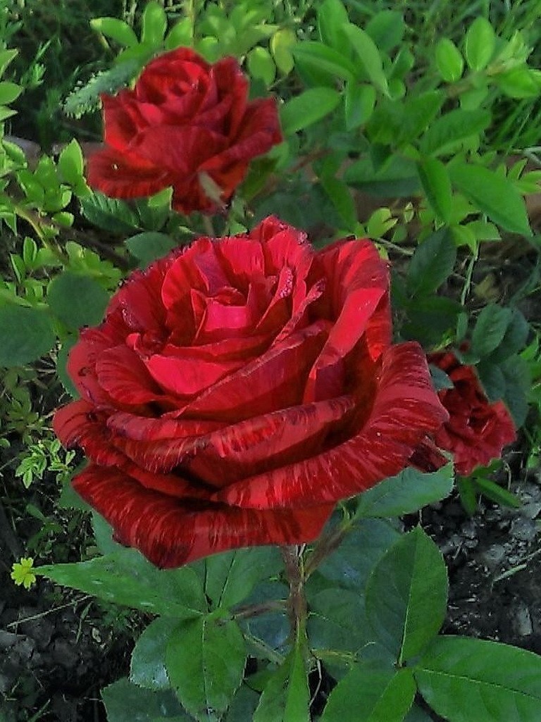 Роза Ред Интуишн (чайно-гибридная) - высота куста 120 см. Цветки красные с темно-красными пятнами и полосами, махровая, цветение непрерывное. Устойчива к заболеваниям.