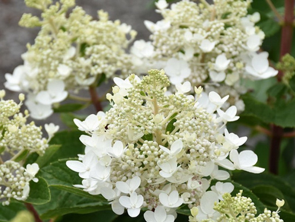 Гортензия метельчатая «Беби Лейс» - высота кустарник 1,2 м. Соцветия крупные, длина 15см. Окраска соцветия белыя, осенью розовая. Цветение обильное и продолжительное.