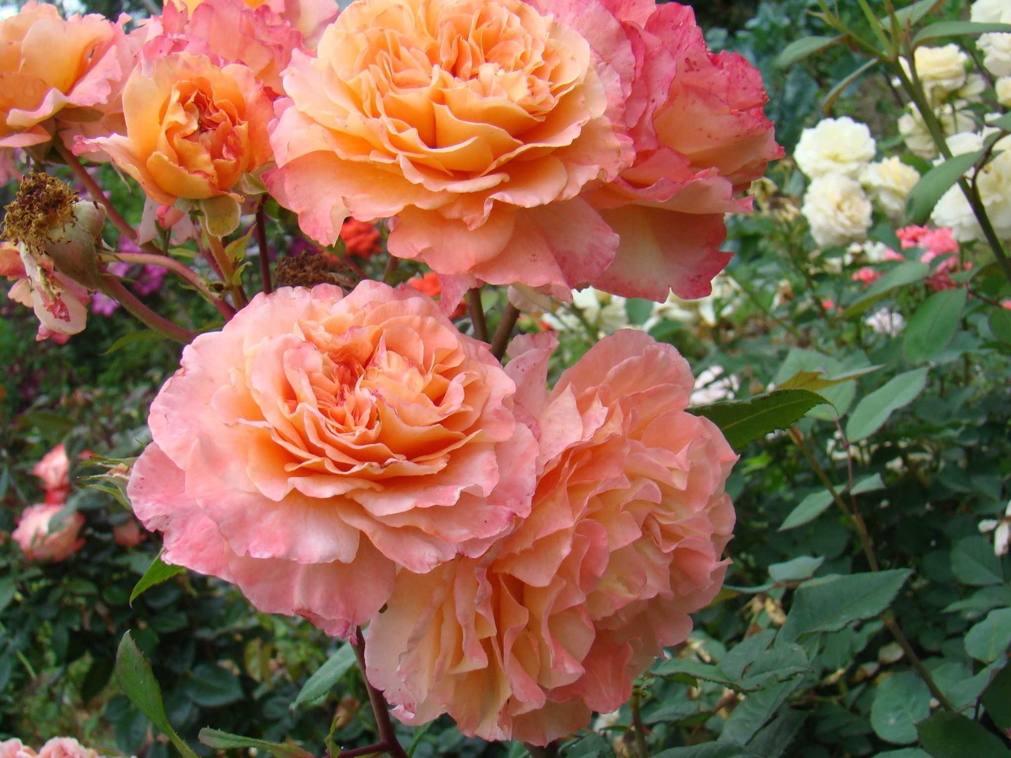 Высота куста: 70-120 см. Диаметр куста: 70-80 см. Диаметр цветка: 10-13 см. Сорт с крупными цветками ностальгической формы. Цветки густомахровые, пышные, необычной розово-персиковой окраски. Лепестки очень нежные, могут повреждаться дождем и ветром, однако это компенсируется обильным цветением. В зависимости от степени освещенности участка и кислотности почвы окраска цветков сорта может меняться на более или менее интенсивную. Молодые бутоны в фазе полуроспуска можно использовать для срезки в качестве компонента букетов. Куст сильнорослый, раскидистый. Аромат цветков хорошо ощущается на расстоянии, он насыщенный, сладкий, фруктовый с нотками малины. Сорт неплохо устойчив к заболеваниям, но во второй половине лета требует профилактических обработок против черной пятнистости.