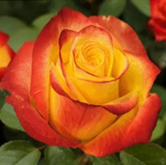 Бутоны с высоким бокалом, цветки крупные, окраска лепестков огненно-оранжевая с красно-малиновым краем. Куст компактный, с большим количеством тёмно-зеленых, глянцевых листьев, с одиночно расположенными цветами на ровных длинных побегах, отлично подходят для флористики, долго стоят в срезке без потери декоративности. Сорт устойчив к продолжительным дождям и грибковым заболеваниям. Цветки практически не имеют аромата