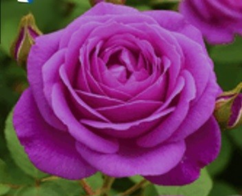 Бутоны бокаловидной формы сине-фиолетового окраса. Цветки средние, махровые (30-40 лепестков), чашевидные, в полном роспуске розетковидные. Лепестки с волнистым отогнутом краем. Аромат сильный, фруктовый. Цветы появляются одиночно или в небольших соцветиях по 2-3 бутона на кисти. Цветки хорошо переносят дождь и сохраняют свою форму. Цветение повторное, обильное, продолжительное. Сорт морозостойкий с хорошей устойчивостью к заболеваниям.