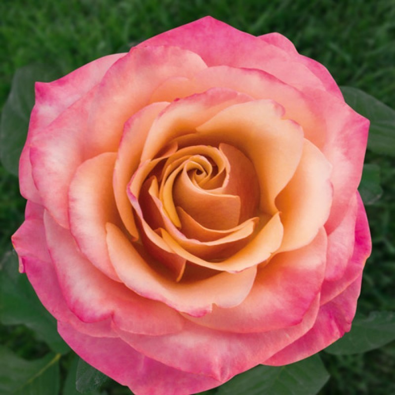 Высота куста: 70-85 см. Диаметр куста: 50-60 см. Диаметр цветка: 9-12 см.Цветки махровые, базовый тон лепестков - персиково-розовый, ближе к корню лепестка проявляется желтая окраска, по краю лепестка проявляется румяный кантик. Листва глянцевая, темная. Аромат средней интенсивности, сладкий.