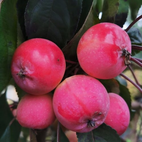 Красноцветковая яблоня Малиновое Ожерелье относится к среднерослым и достигает 1,4-1,6 метров высоту. В разгар весны она усыпана ароматными красно-лиловыми цветками. Ко второй половине лета дерево начинает обильно плодоносить, радуя хозяев сочными и аппетитными яблочками. Их кожица плотная и глянцевая, с небольшим восковым налетом, красно-малинового оттенка. Мякоть ароматная, хрустящая, с выразительным кисло-сладким вкусом и миндальными нотками. Кроме того, яблоня славится хорошим здоровьем, крепким иммунитетом и замечательной зимостойкостью в условиях нашей полосы